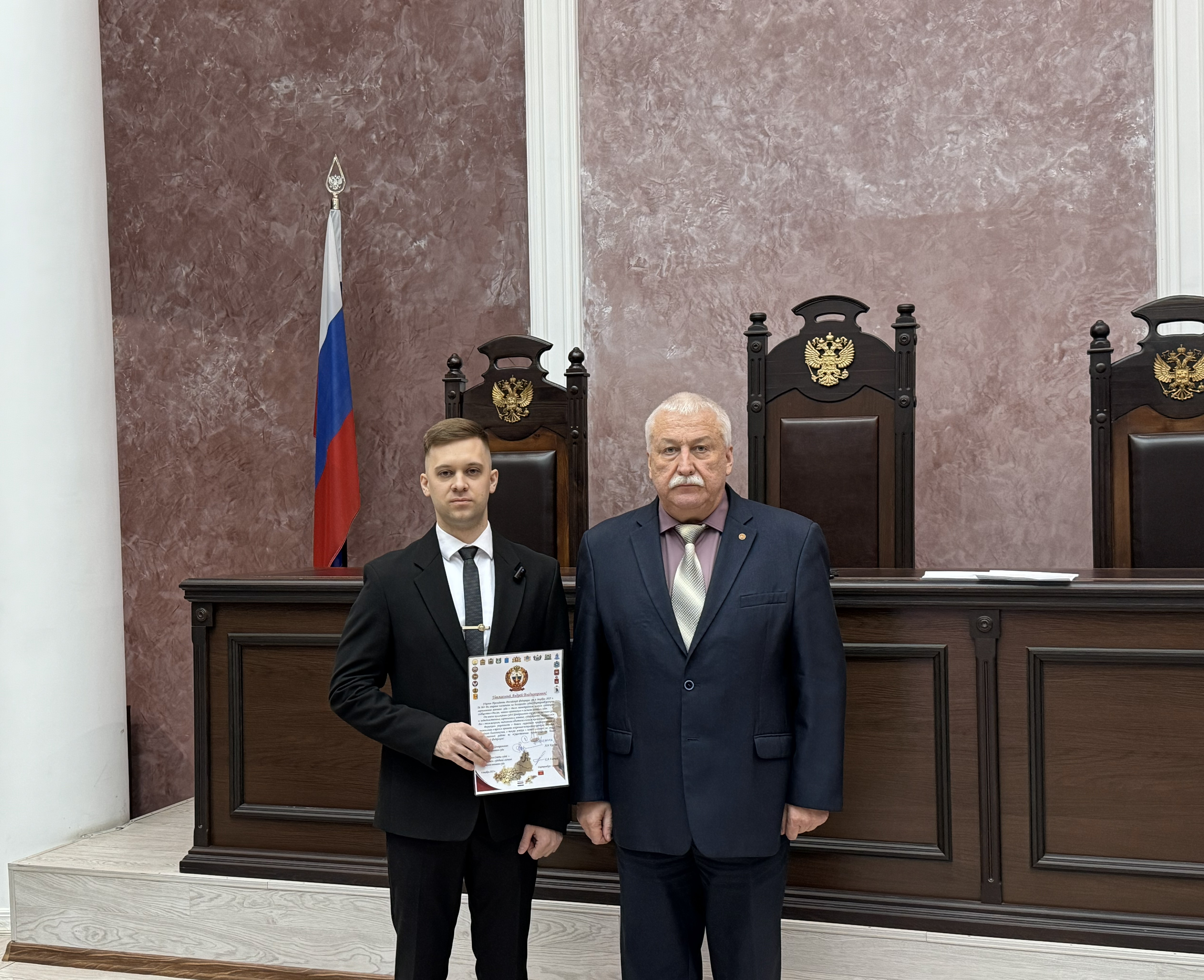 Сегодня, 15 декабря 2025 г., на служебном совещании судей Центрального окружного военного суда, с участием председателя Екатеринбургского гарнизонного военного суда В.А. Харечко впервые назначенный Указом Президента Российской Федерации от 8 декабря 2025 года № 904 на должность судьи Екатеринбургского гарнизонного военного суда Петров Андрей Владимирович принял Присягу судьи. Андрей Владимирович начал свою профессиональную деятельность в июле 2019 г., поступив на должность секретаря судебного заседания в Челябинский гарнизонный военный суд. Это был первый шаг в его карьере на государственной гражданской службе, где он познакомился с судебной системой, процессуальными документами и требованиям, предъявляемым к работникам аппарата военного суда. С сентября 2019 г. до июня 2021 г. Андрей Владимирович совмещал трудовую деятельность в гарнизонном военном суде с обучением в Российском государственном университете правосудия (РГУП) имени В.М. Лебедева по направлению подготовки магистров, а также до сентября 2020 г. продолжал обучаться в военном учебном центре при этом же университете по программе военной подготовки офицеров запаса. После завершения обучения ему в соответствии с приказом Министра обороны РФ присвоено воинское звание лейтенанта юстиции запаса. Усердие и компетентность Андрея Владимировича не остались незамеченными. В феврале 2022 г. в порядке продвижения по службе был назначен на должность помощника судьи Центрального окружного военного суда. Это назначение стало закономерным этапом начала его профессиональной карьеры, а для добросовестного работника аппарата суда открылись новые возможности для дальнейшего роста и совершенствования в юридической профессии. Петров Андрей Владимирович имеет классный чин «Советник юстиции 2 класса». Его путь — пример того, как целеустремленность, преданность профессии и стремление к профессиональному росту помогают достичь реального успеха на государственной службе. Александр Иванович Каргин, председатель Центрального окружного военного суда, в ходе процедуры приведения судьи к Присяге поздравил Андрея Петрова с назначением на должность судьи, отметив, что указанная должность – большая честь и высокая ответственность. Пожелал мудрости, твердости, справедливости и беспристрастности в принятии решений. Вновь назначенный судья поблагодарил коллег за доверие и выразил готовность исполнять свои обязанности, как велят ему закон и совесть. Выражаем твердую уверенность в скорейшем становлении и желаем профессиональных успехов вновь назначенному судье Екатеринбургского гарнизонного военного суда Андрею Владимировичу Петрову! Пресс-служба Центрального окружного военного суда.