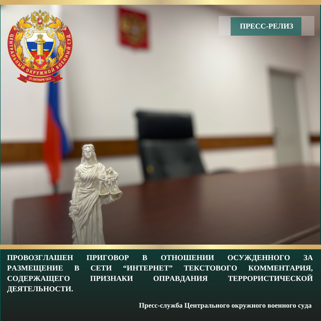 | В Центральном окружном военном суде провозглашен приговор в отношении несовершеннолетнего Г., признанного виновным в совершении преступления, предусмотренного ч. 2 ст. 205.2 УК РФ (публичное оправдание терроризма, совершенное с использованием сети Интернет), на основании которой осуждённому назначено окончательное наказание в виде штрафа в размере 25 000 руб. с лишением права заниматься деятельностью, связанной с администрированием сайтов и каналов с использованием электронных или информационно-телекоммуникационных сетей, в том числе сети «Интернет», на срок 2 года.