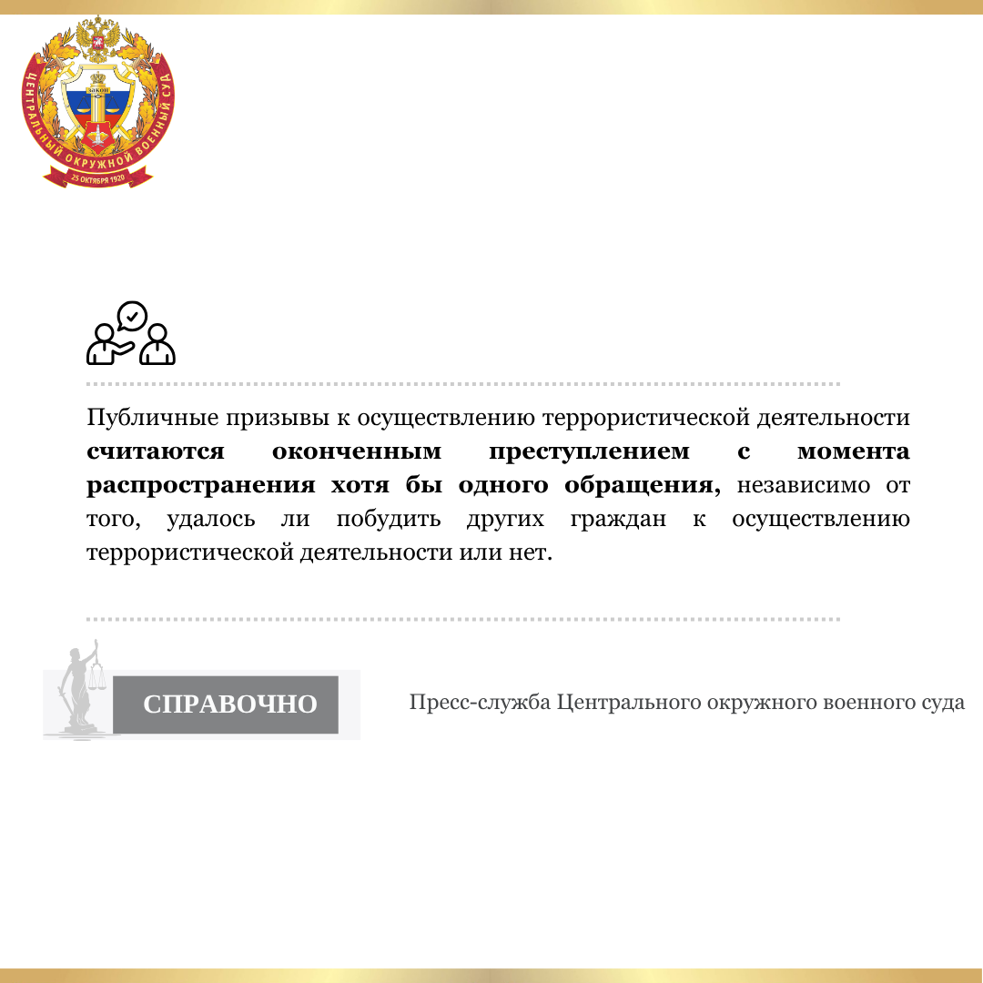 Публичные призывы к осуществлению террористической деятельности считаются оконченным преступлением с момента распространения хотя бы одного обращения, независимо от того, удалось ли побудить других граждан к осуществлению террористической деятельности или нет. |